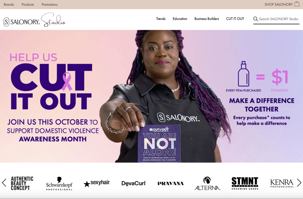 A recent example of how brands can use e-commerce platforms for good is a campaign we created for our client, Salonory, a Henkel B2B platform serving salon professionals. For Domestic Violence Awareness Month, Salonory partnered with the Professional Beauty Association (PBA) and CUT IT OUT®, a national nonprofit organization that mobilizes salon professionals to raise awareness and prevent domestic violence through training and education.